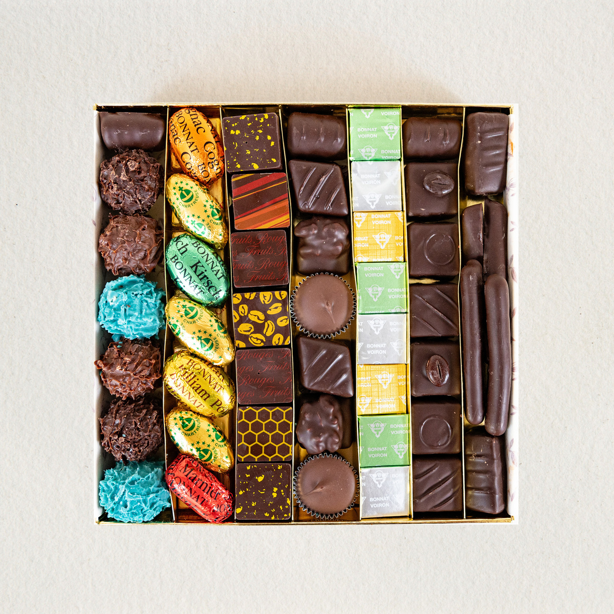 Les contenus des boites et ballotins Bonnat sont des assortiments choisis par la Maison Bonnat parmi les chocolats présents ci-contre.